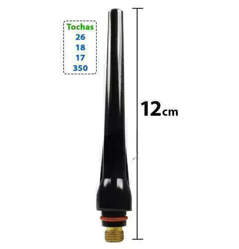 A capa longa é um acessório da tocha tig, localizado na parte de trás da cabeça da tocha. Tem como função proteger e segurar o eletrodo tungstênio , através da capa é possível ajeitar a altura do tungstênio. Este modelo de capa curta, é compatível com tochas tig modelo 26 - 17 - 18 – 350.